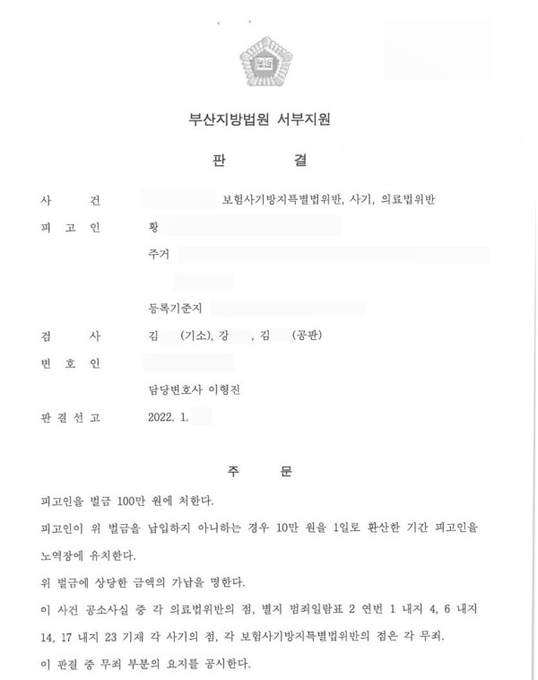의뢰인은 치과에서 보험청구 업무를 담당하였으며, 보험회사로부터 보험금을 받기로 공모하며 일부 손님들의 실제 수술 횟수를 조작하였기에 보험사기방지특별법위반, 사기, 의료법위반으로 처벌을 앞둔 상태였습니다.