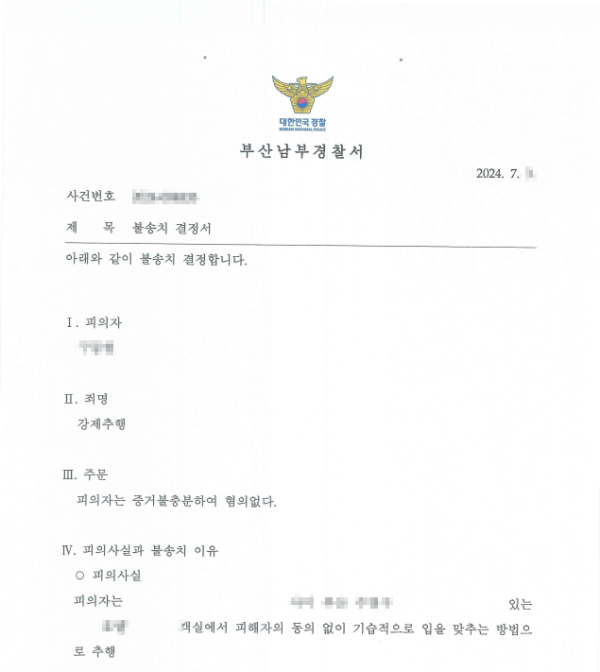 피해자는 의뢰인으로부터 추행을 당했다고 주장하여 경찰에 송치된 상태였으며, 빠른 시일내에 법무법인 파트원의 도움을 받은 결과, 혐의없음(증거불충분)으로 사건을 마무리할 수 있었습니다.