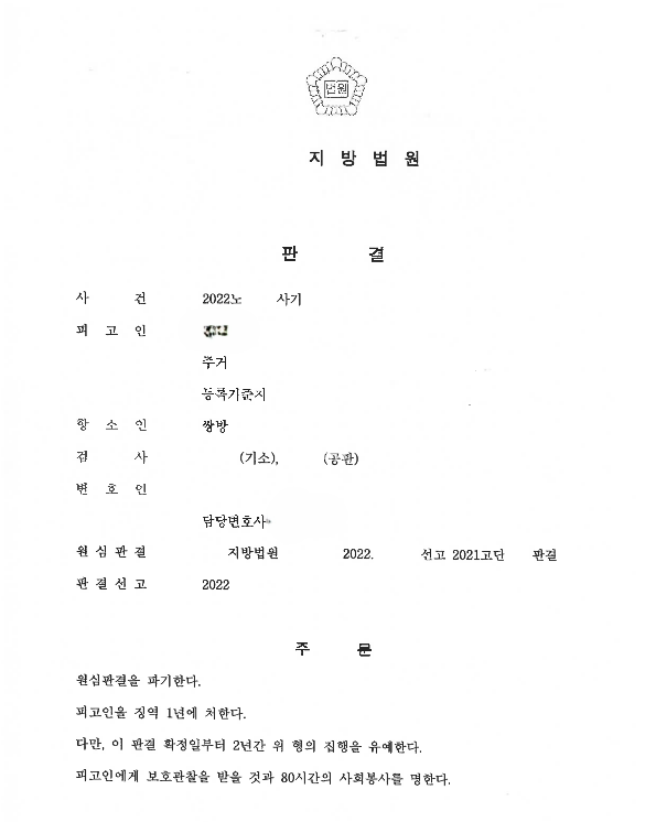 하지만 법무법인 파트원의 조력을 받아 징역 1년에서 집행유예로 이끌어 낼 수 있었습니다.